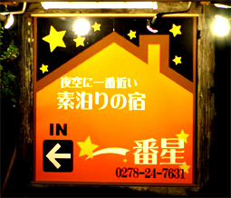 | 我が家がとても気に入っている宿です。 ポチの庭のある群馬県昭和村には宿が2軒しかありません。1軒は別荘地の敷地内にある村営の山荘。もう1軒がこの一番星です。 2006年11月に出来たばかり。素泊まり専用でとても安いのが魅力。ボンビーな我が家には助かります。 |