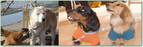 | 2002年5月清里へ旅行した時に同じ宿に泊まり合わせました。その時、ミントちゃんは私達のお部屋にご訪問下さり、おまけにポチくんのハウスの中もチャカチャカと探検してくれました。とっても可愛い女の子で,いつも可愛いお洋服を着せてもらっています。わんこなのに人間より衣装持ちかも。何年かの間、毎年決まった時期に住宅展示場でアルバイトをし、犬仕様の住宅でデモンストレーション犬を勤めました。病気のため、2015年1月20日に14才を目前にして、虹の橋のたもとへと旅立ちました。本当に本当に、可愛い子でした。 | 2004年8月山中湖を旅行した時、観光中にチャタママさんとパパさんから声をかけられて立ち話をしました。当時、チャタくんは12才半でした。2005年に妹分のシュリちゃんを家族に迎えてからチャタくんはますます元気。シュリちゃんはまろまゆが個性的な人なつっこいハツラツ娘です。旅先で出会ってからチャタ家とは仲良くして頂き、2006年8月に軽井沢、10月に清里を一緒に旅行しました。一生思い出に残る楽しい旅になりました。 と、書き、ホームページの準備を進めていた中、2007年12月29日、突然チャタくんが虹の橋へと旅立ちました。15才10ヶ月でした。後ろ足が弱り体重も落ちていることは知っていましたが、2月に16才のお誕生日を元気に迎えられるものと信じていたのでとても残念です。旅行の写真を見るとこんなピカピカの笑顔ばっかり。笑顔が可愛いチャタくんはもういないのですね。 我が家は通常真夏の旅行は避けていたのですが、たまたま夏に旅行した時にチャタくんと出会えました。その「たまたま」はチャタくんと出会うためだったのかも知れません。チャタくんに出会えて本当に嬉しかったです。一緒に旅行したことは一生の思い出です。 チャタロウくんとシュリちゃんのホームページ |