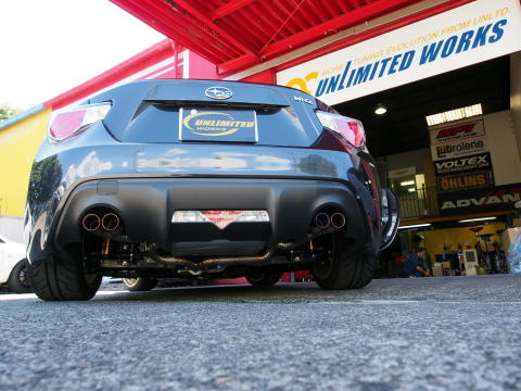 | 60φ4本出しフルチタンマフラー 86/BRZ用 \360,800(サブタイコ付)(税抜¥328,000) \335,500(サブタイコ無)(税抜¥305,000) ランエボ用で大好評のフルチタンマフラーに86/BRZ用が登場。 とにかく手間のかかった逸品です。フランジ部分もサイレンサー内部も絞り無しの60φ。 音量は車検OKな静かさです(サブタイコ付き) 出口は60φ×4の左右出しです。テールエンドは切りっ放しではなく厚さをもたせた形状。 ※インナーサイレンサー装着ご希望の方は通常テール形状も作成可能 中間パイプはサブタイコ付きと無しの2種類ラインアップ。ノーマル+アルファのジェントルサウンドなら タイコ有りを。スポーティサウンドなら無しを選択して下さい。もちろんどちらも快音です。