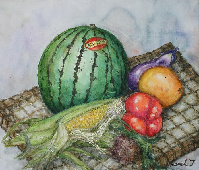 | 美味しそうなスイカですね。ただ、右のオレンジでしょうか、やや描写が足りなくて浮いているような感じです。陰影のつけ方も足りません。(掲載H28.4.28) |