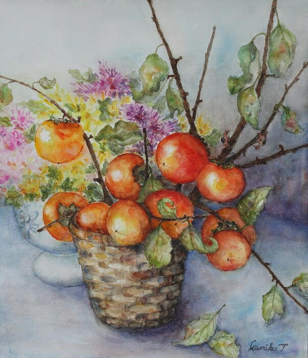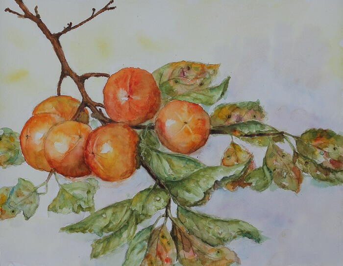 | 柿の実の表現は合格だと思います。みずみずしい美味しそうな柿ですね。背景の処理がいまいち。(掲載H28.4.29) |
