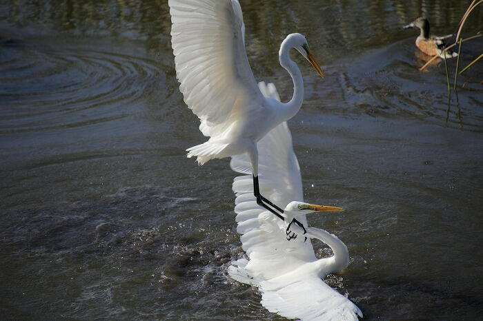 | 晩秋のこざと公園です。冬鳥のはしり、カモたちもやって来ています。ここで二羽のだいさぎが縄張り争いなのか、大げんかです。足で相手の首を絞めるなど、相当荒っぽい争いでした。とうとう最後に一羽が逃げ出しましたが、めったに目にしない貴重なシーンだと思いますので、4枚掲示いたします。(撮影11月1日) |