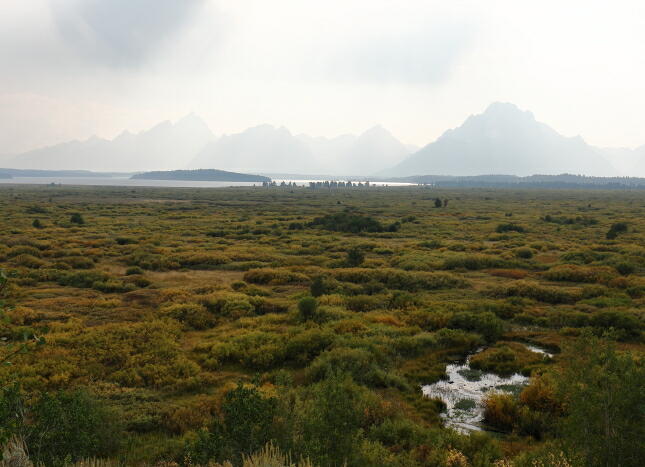 のティートン山脈の遠望です。ガスがかかってよく見えませんね。 ![]()